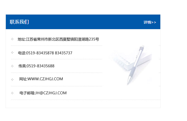 傳真:0519-83435688    郵編:213135    網址:WWW.czjhgj_com.wfscgj.com    電子郵箱:JH@czjhgj_com.wfscgj.com